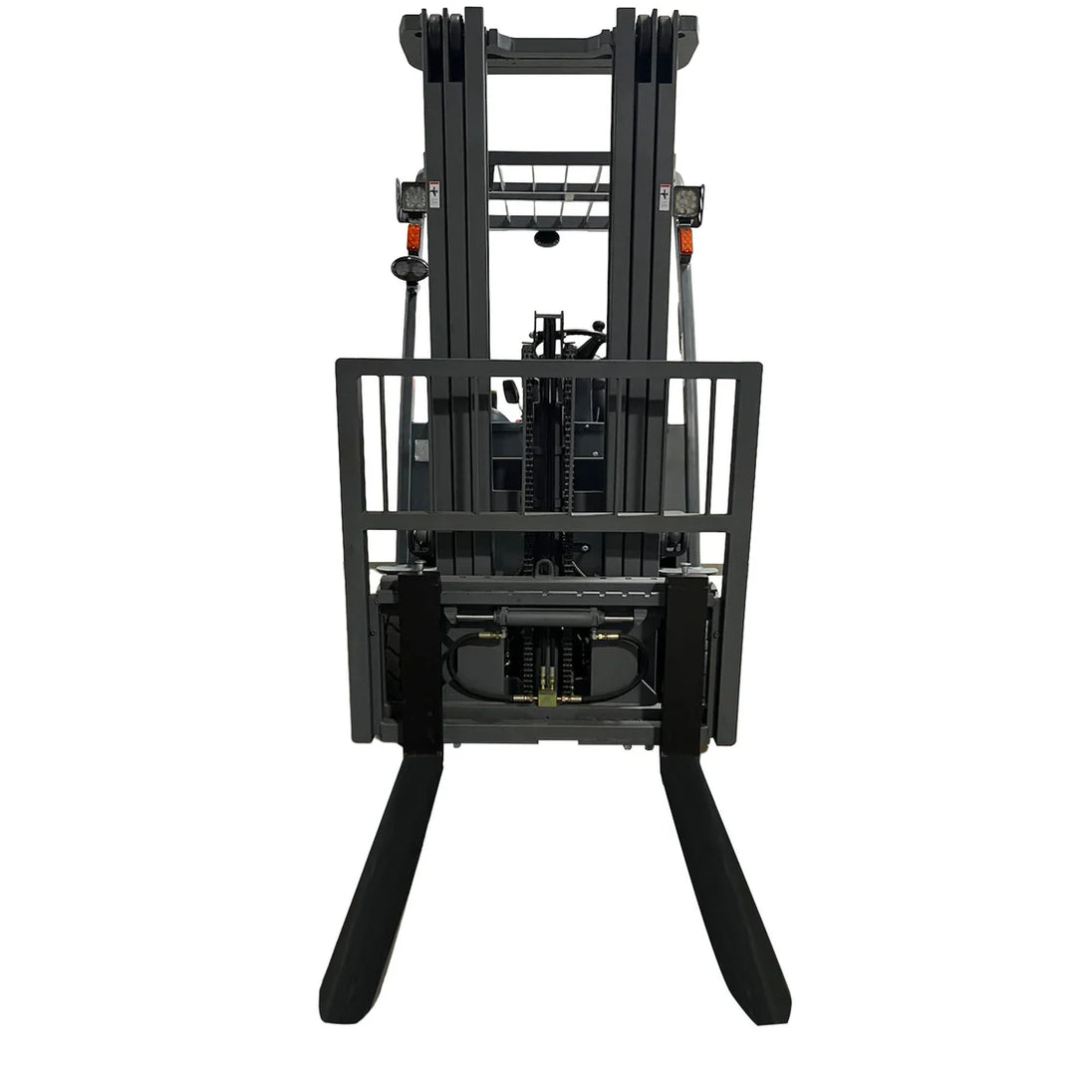 The mast assembly includes a height cut-off valve that limits lift above the 197" point. A hydraulic cushioning valve prevents rapid descent near ground level. In the event of control failure, a manual descent valve on the hydraulic pump can be activated. All forklifts are equipped with overload warning and travel speed limiter to reduce risk under heavy loads.